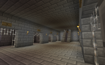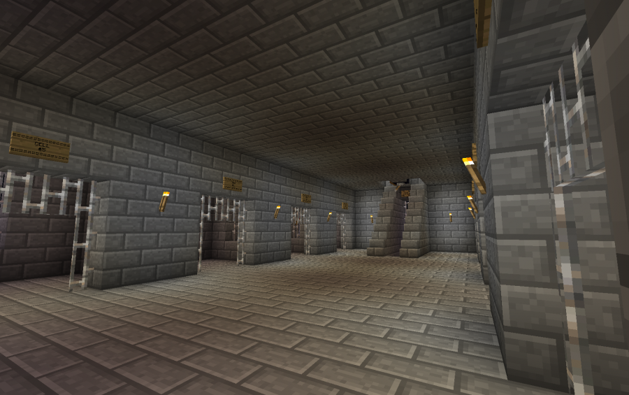 I had a look. Found the eight cells, each with no "door" or other from of closure. Could not find the isolation cell nor the room depicted in the lowest of the three pictures above. I understood that the upper floor was the visiting room, but was unable to understand the purpose the lava retained by pistons at the entrance. There were four outer pistons in the entrance of which the purpose was also unclear. Overall the structure had the grim "air" of a prison about it and on an adventure map, without block-breaking ability, it could serve its said purpose. It seemed to lack "staff" areas, where any door and lock controls would be expected to be located, out of reach of "prisoners". (The trapdoor control was accessible to prisoners). |