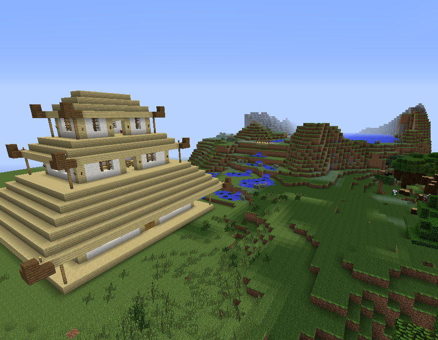 this house inspired by the design of an Asian pagoda is the product of my latest survival venture. The schematic includes the large pagoda and a pond dotted hill based off Japanese rice fields with a large lake on the top of the hill. The house has three main floors and a small floor between the first and second floors which has furnaces crating tables and chests lastly the top floor has two beds and a jukebox. rte and comment if you like it.