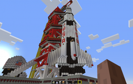 Saturn V rocket with extensive launch tower. The tip of the rocket is hollow and set-up for TNT boosting, and the center of the launch tower uses a minecart elevator. Please rate me if you enjoy and appreciate the schematic. below is the a list of the blocks