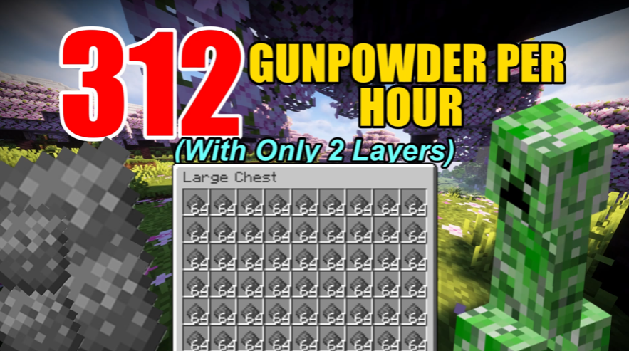 This is a 2-level creeper-only gunpowder farm that produces approximately 312 gunpowder per HOUR under ideal conditions. The design is simple and beginner-friendly, requiring no cats to function.