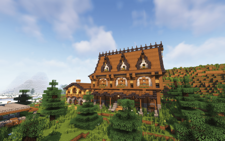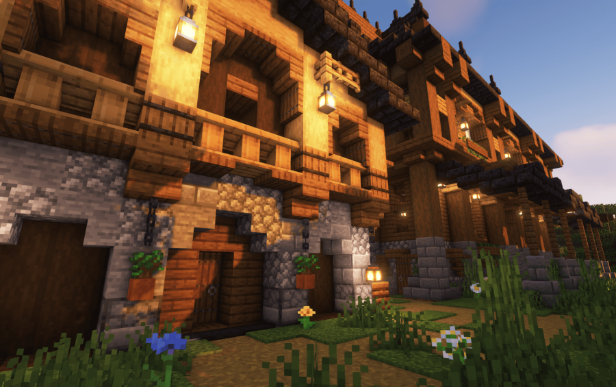 This build is a large medieval-style trading hall, perfect for housing villagers in survival or roleplay worlds. It features a detailed wooden and stone structure with a steep gabled roof, flower boxes under the windows, and warm lantern lighting for a cozy, immersive look.