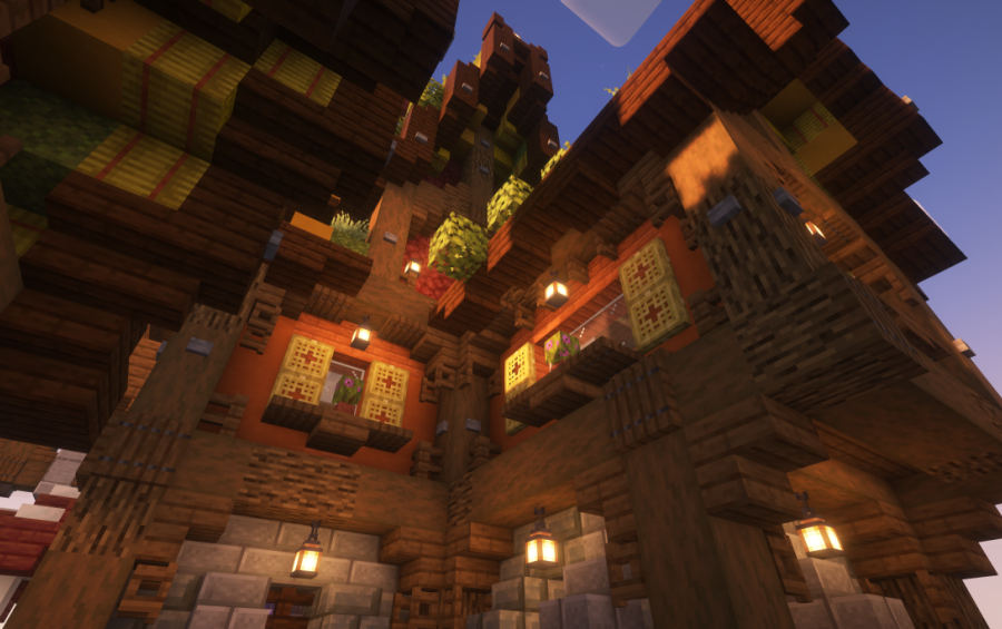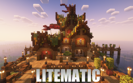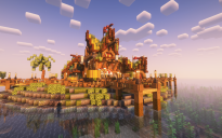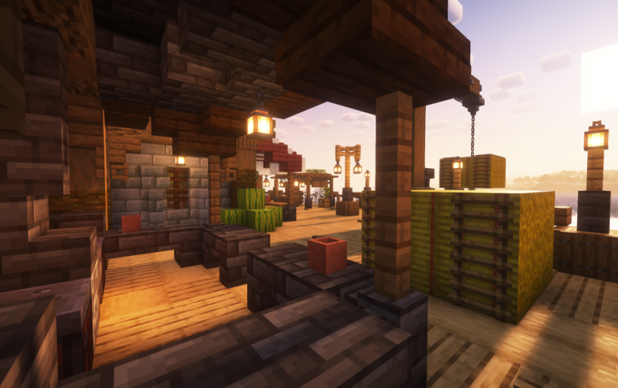 A cozy harbor build featuring rustic houses, storage areas, and a lively dockside atmosphere, perfect for trade and seafaring adventures.