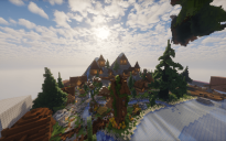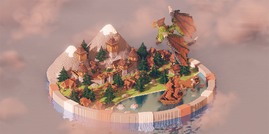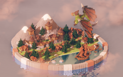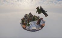 A striking medieval style PvP arena featuring snowy mountains, a dragon perched above, and a serene harbor with a boat and water areas. The map includes detailed medieval houses, towers, and lush trees, creating an immersive battle environment.