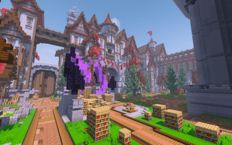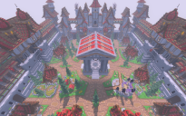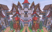 A fortified Factions Spawn designed in a medieval style, surrounded by towering red-roofed castles and defensive walls. Blending structure and aesthetics, this build is ideal for competitive gamemodes like Factions.