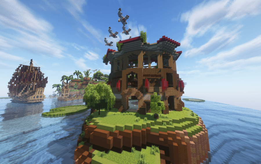 Around the central area, players will discover rich detailing, including graceful birds in flight, decorative ships, natural waterfalls, and lush floral landscapes. A central portal serves as the main spawn point, making navigation intuitive.