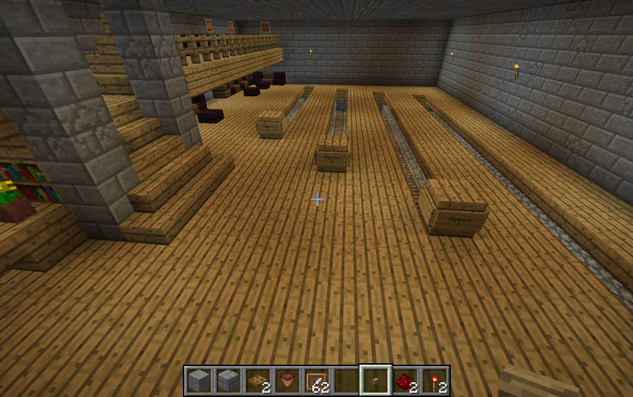 Small train station. Ground level lobby, lower level platforms. Four tracks each leaving to the cardinal points. Hidden button to receive carts.