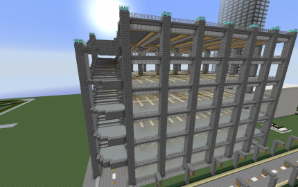 A multi-storey car park with stone brick columns and iron floor supports, ramps and parking spaces. Glowstone lighting on each level.