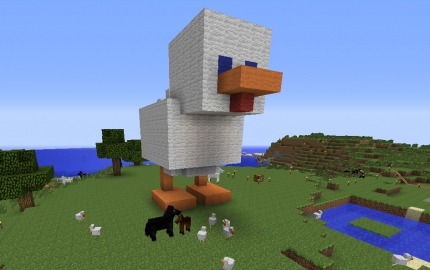Large chicken filled with normal chickens. The eggs fall down between the big chickens legs.