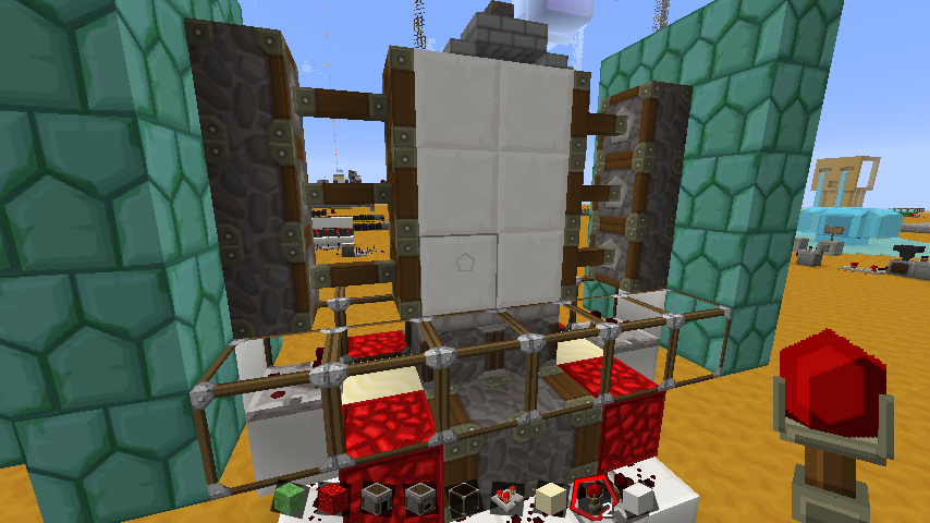 To activate the door, putting a redstone torch on the bottom 2 blocks from either side of the door to open; it will automatically reset itself after a while. That seems a bit of a secret for not using any button or lever.