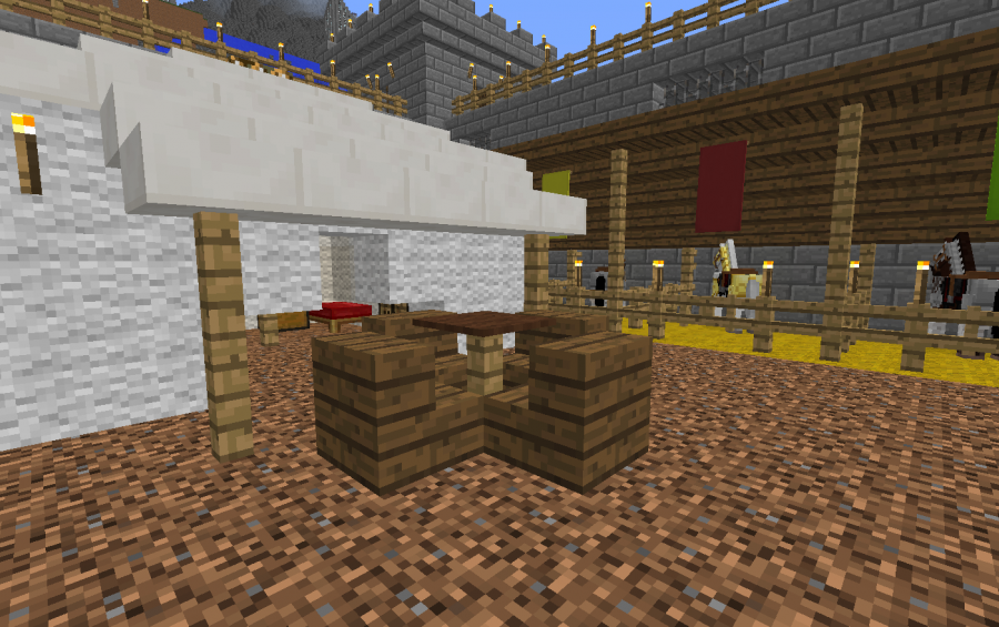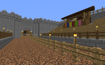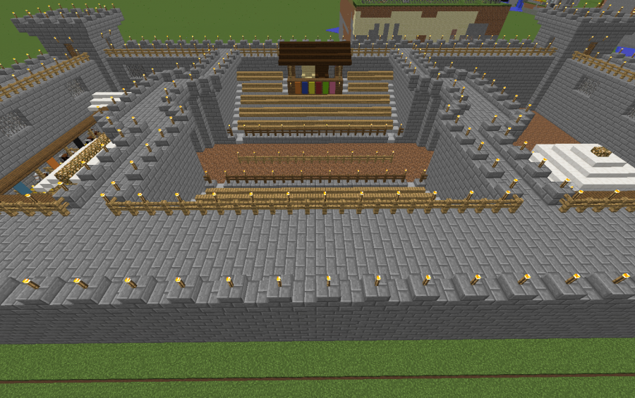Tournament grounds, designed to be added as part of your castle. The grounds feature grandstands, a royal viewing box, a marketplace for vendors, stalls for visiting knights' horses, and room for nobles to pitch their tents.