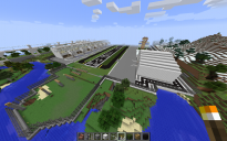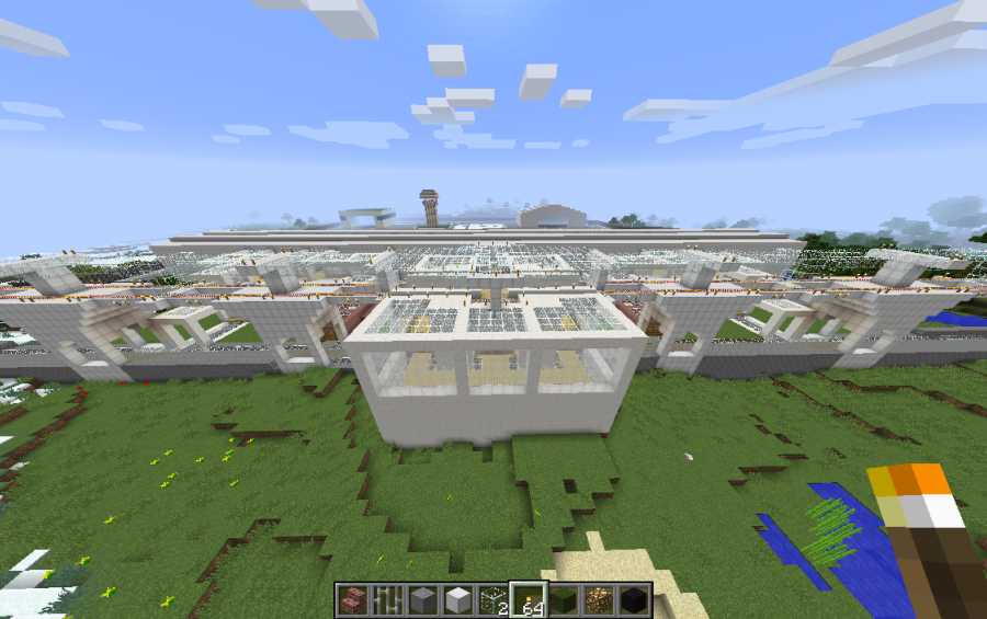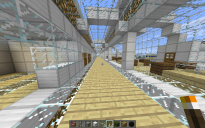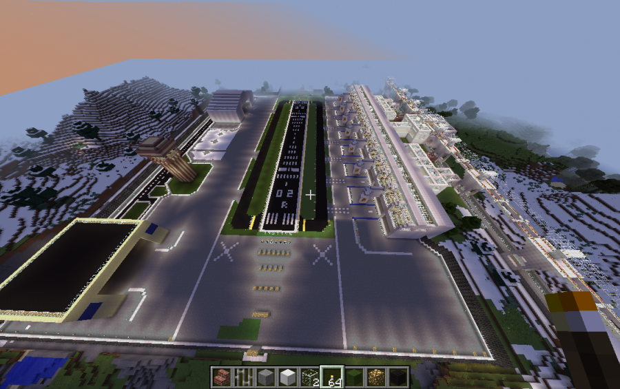 All of this was built again before MCEDIT (I do have other after that). This took one month to build as I had to excavate an entire mountain for a nice piece of flat land (TNT). This airport is very, very large. I believe that I have included most of the surround parts, including my upper level rail station as well as the lower level train station (as I took it to 41 blocks high and low). One Airport Tower, two hangers, one with a propeller plane inside and a service road around the back. Security Fence around the airport. Runway lights and descending landing lights(cut size removed some outer lights). It snows in my area, so the ground may be cover with snow in some areas. It is so big, I had to take an aerial shot. One Runway (I want two) and two Taxi runways. Room for up to 7 planes as there is 7 Terminals bays in this airport. Someday, I was planning on adding a Luggage return section, but it is too much work. I will leave that to your imagination. Every now and then, I come back to the airport to make changes, here is the latest. To measure it up in your world, place the runway height at 68, using F3.