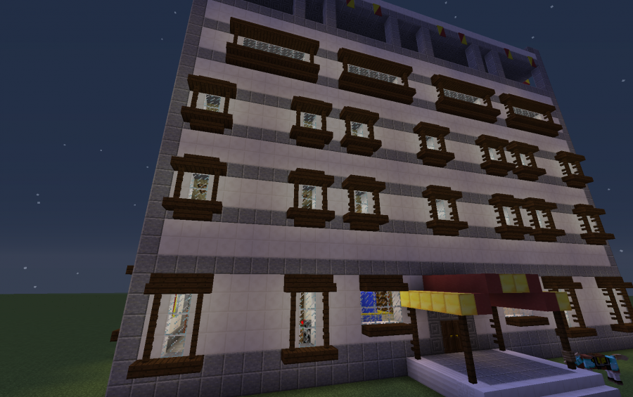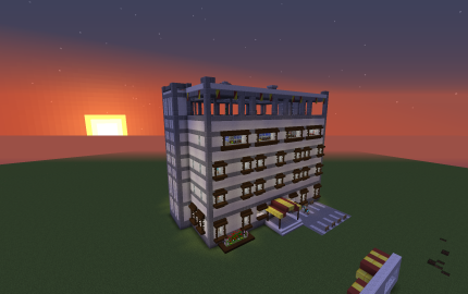 A large apartment building with 20 apartments, a rooftop pool, two story restaurant, and a parking lot for horses.