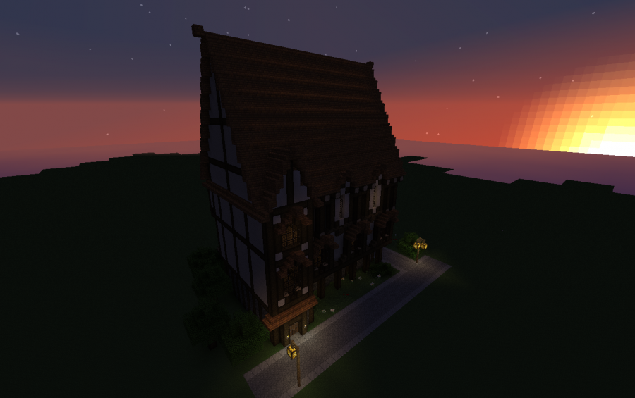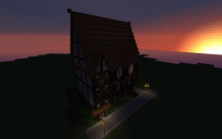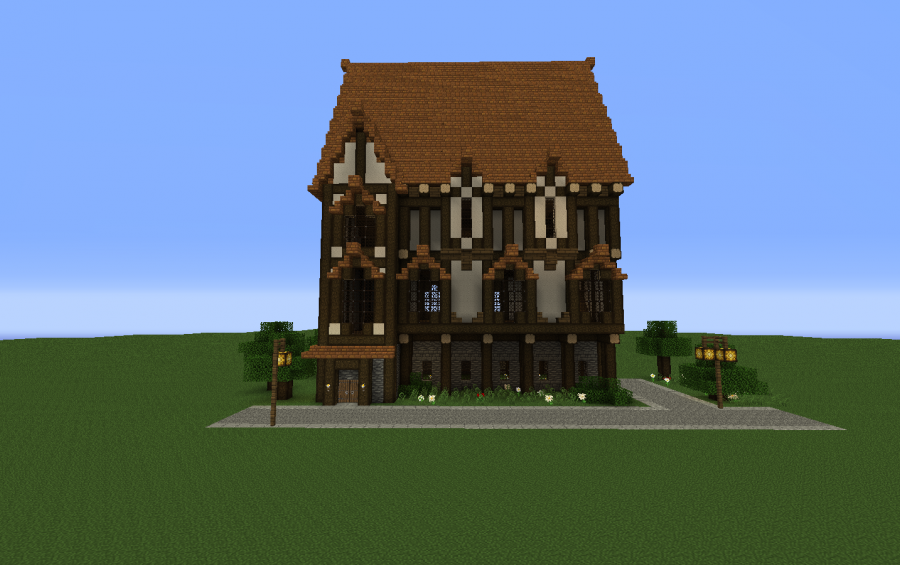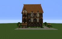 A large 3 floored (plus large attic) medival styled townhouse. Made primarily out of oak wood, oak wood planks, brick and white wool. Comes with a structural finished interior ( floors and stair cases ) but no furniture. Best for highly populated urban areas, i also suggest placing it in close proximity to other buildings. Built using the FeatherSong texture pack by SteelFeathers, so i would suggest using it with that.
