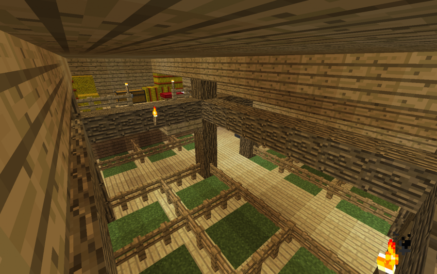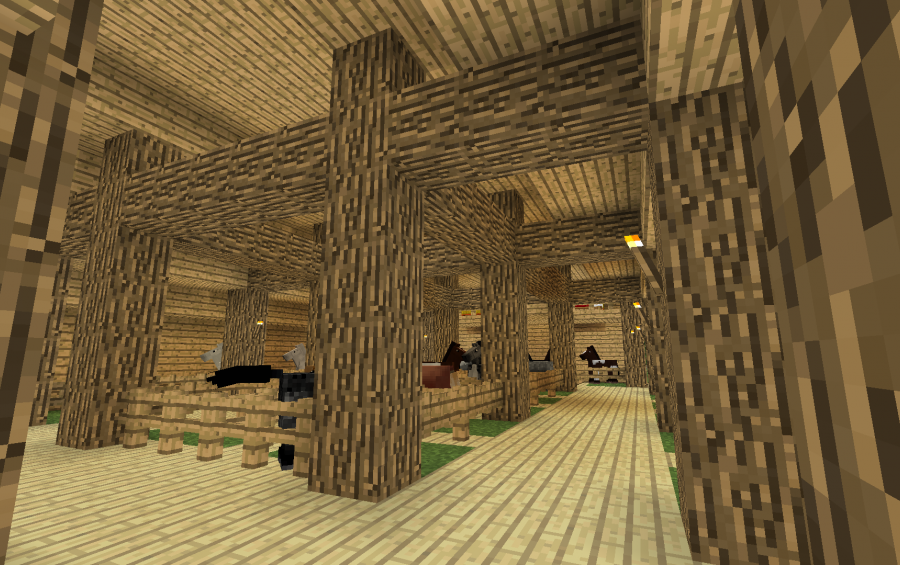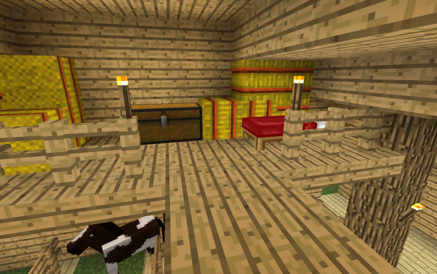 Horse Stable with 23 pens, a storage area with hay and a bed, and a pasture outside.