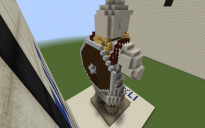 The shortsword is made of iron and dark prismarine.The buckler is made of spruce wood and iron blocks. The Shield is hold on by two straps, which are made of nether brick fence.