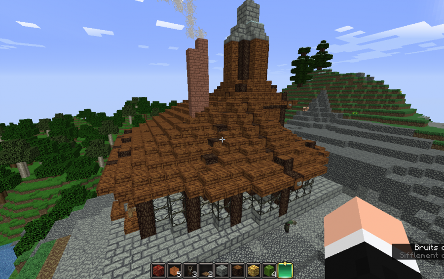 Une grande maison médieval avec un étage, une cheminée, une piece avec vue panoramique