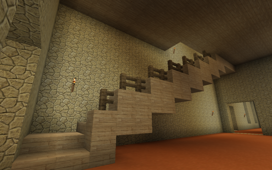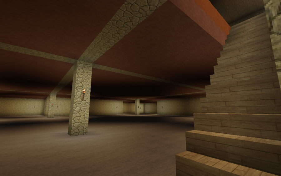 64 x 64 sandstone building. has basement and interior walls and stairs but no furnishings. pastes directly in front and center of you at ground level when you face north.